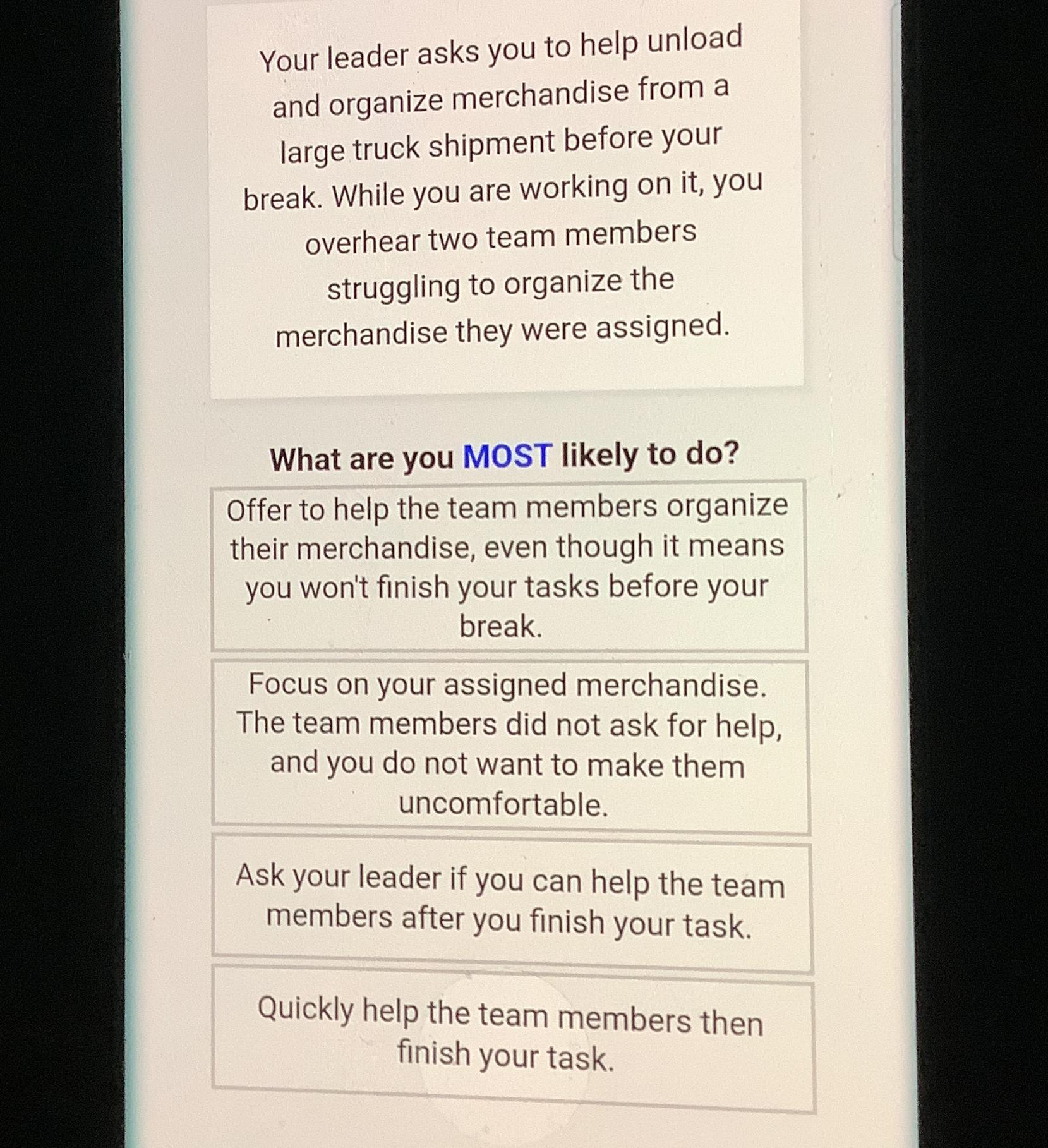 The most likely thing you would do is quickly help the team members then finish your task. Team spirit and collaboration are essential in a workplace. The most like how i would respond is: Quickly help the team members then finish your task. The least like how i would respond is: Focus on your assigned. A) offer to help the team members organize their merchandise, even though it means you won't finish your tasks before your break. In a team, it's crucial. Webjan 28, 2024 · your leader asks you to help unload and organize merchandise. Websep 9, 2023 · what are you least likely to do? Offer to help the team members organize their merchandise, even though it means you won't finish your tasks before your break. Webyour leader asks you to help unload and organize merchandise from a large truck shipment before your break. While you are working on it, ๏ปฟyou overhear two team members. Webyour leader asks you to help unload and organize merchandise from a large truck shipment before your break. While you are working on it, you overhear two team members. Webyour leader asks you to help unload and organize merchandise from a large truck shipment before your break. While you are working on it, you overhear two team members ,. Evaluate the options given in terms of teamwork, efficiency, and communication. Consider the potential consequences of each action on the team's overall.
